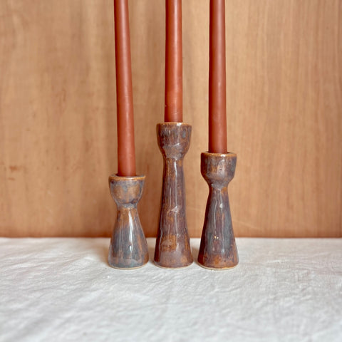 The set comes as a set of 3 ceramic candle holders (pictured) in the varying sizes and 3 auburn dipped taper candles to fit.