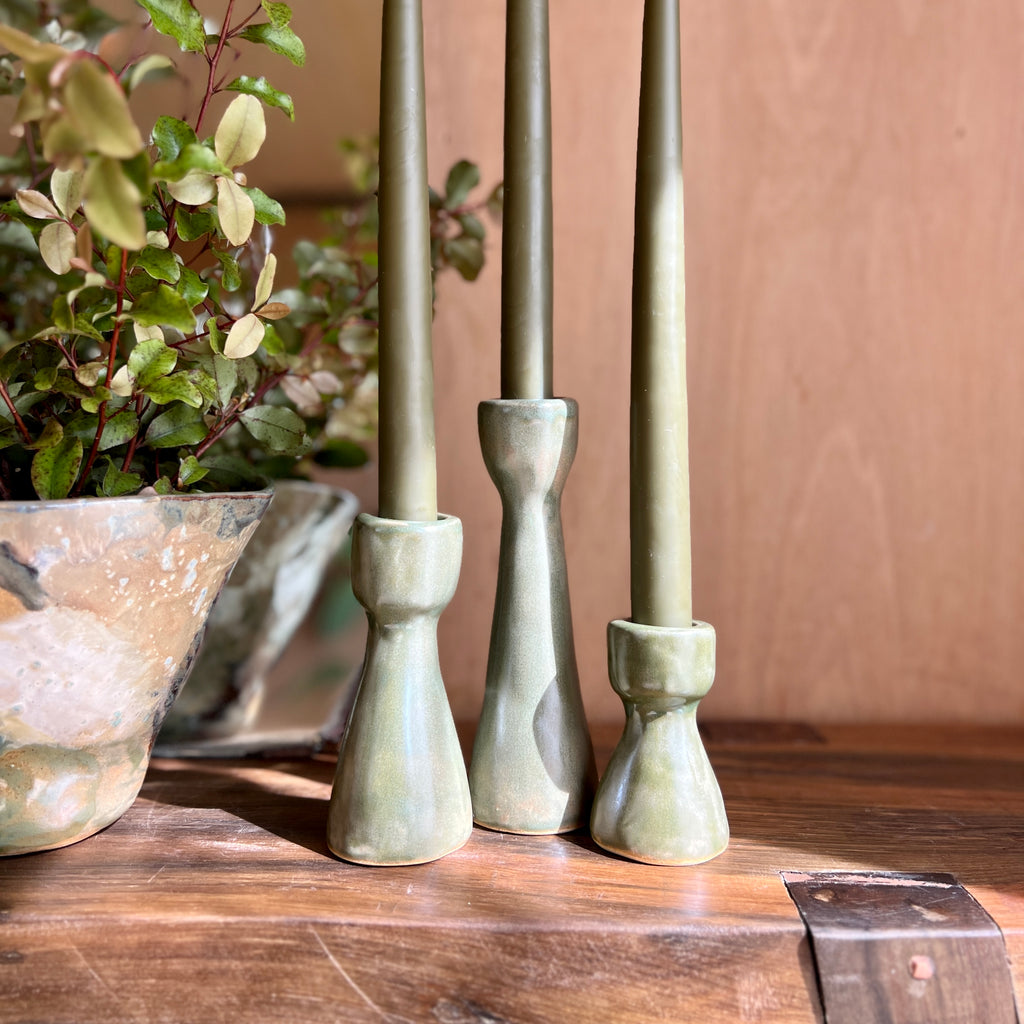 This set of sage coloured ceramic holders are a a beautiful set pairing perfectly with the olive tapers.