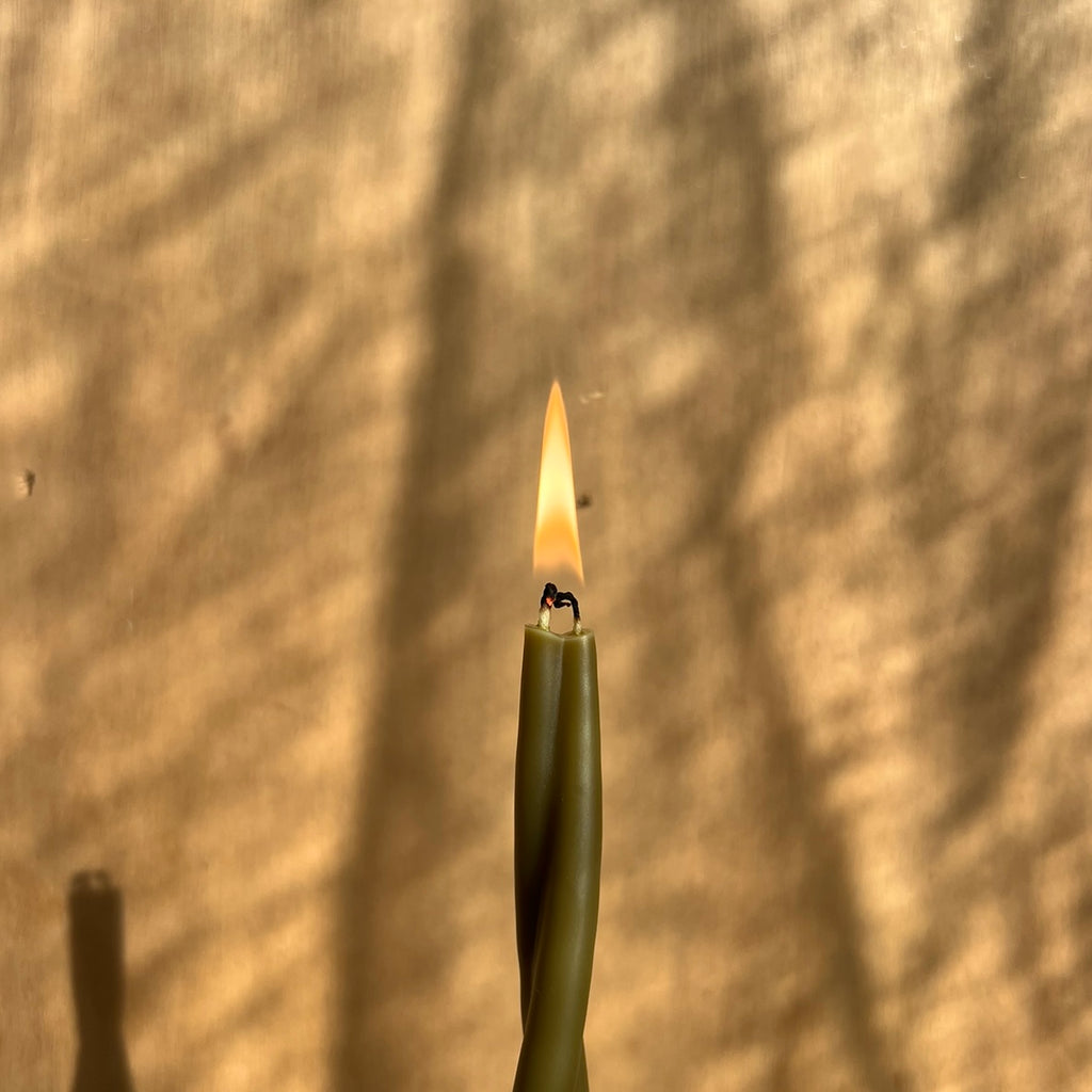 The beautiful twist candles are hand made using the hand-dipped method.  Wick is dipped into melted wax repeatedly until the required thickness has developed. 2 candles are then gently twisted together to create a double wicked twist candle.